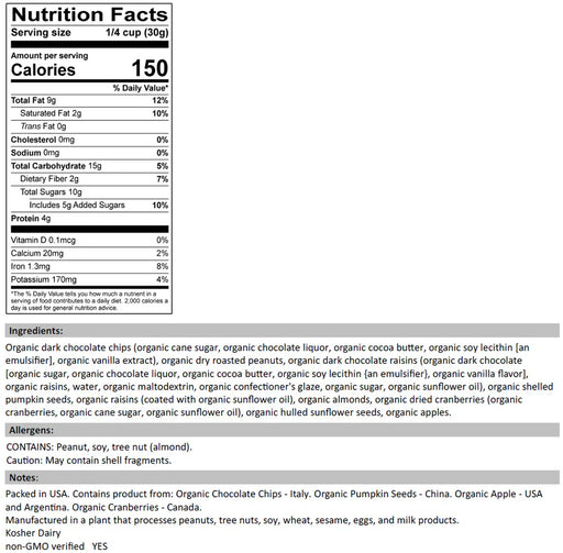 View full detailsEnjoy the delicious combination of dried fruit, nuts, and of course chocolate in this trail mix!Contains dark chocolate chips, dry roasted peanuts,...