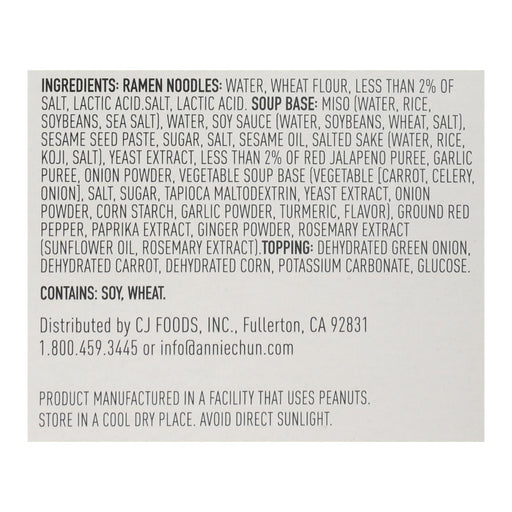 View full detailsDelight in the appetizing fusion of Korean flavors with Annie Chun's Spicy Miso Ramen. Each convenient 5.4 oz pack delivers a symphony of savory mi...