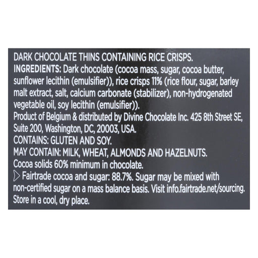 View full detailsDivine - crisp thns dark chocolate - case of 12 - 2.8 ozcountry of origin : belgiumis fair trade item : yessize : 2.8 ozpack of : 12selling unit ...