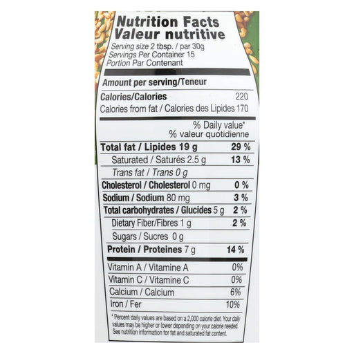 View full detailsHaddar Tahini Seasoned is a delicious blend of roasted peeled sesame seeds, parsley, salt, dehydrated garlic and onion, citric acid, vegetable pa...