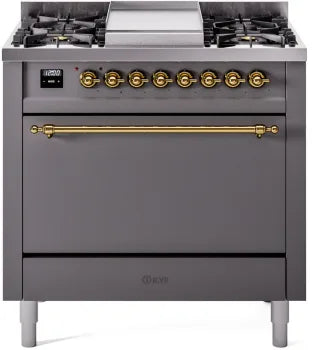 View full detailsILVE Nostalgie II 36 " Dual Fuel Natural Gas Range, Graphite Matte Brass Trim, UP36FQNMPMGG Please call (800)604-1380 Ext#2 before placing your or...