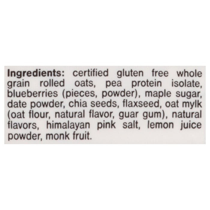 This overnight oatmeal is crafted with care using certified gluten-free whole grain rolled oats, pea protein isolate, oat mylk, powdered dates, maple sugar, whole and powdered blueberries, chia seeds, hemp hearts, Himalayan pink salt, and monk fruit. Each ingredient is carefully selected to ensure a delicious and nutritious breakfast experience.