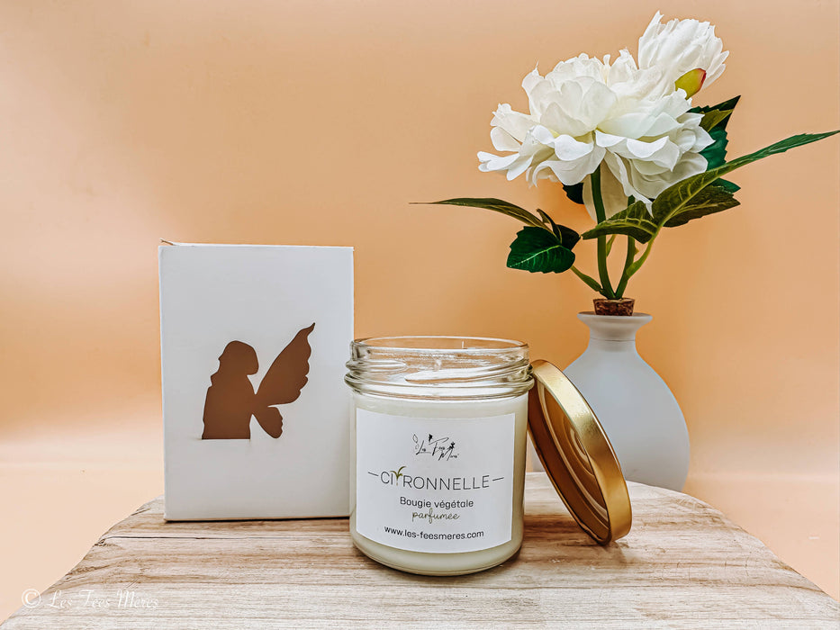 "Create a soothing atmosphere while repelling the mosquitoes with this hand-made lemongrass scented candle! Hand-made in the Vosges, France Time of diffusion : 22 h It’s carefully presented in its white box which has an opening carved on it’s front side to see the product. The boxes are white with different wood-like shades to go with the vegetal aspect of the product.
