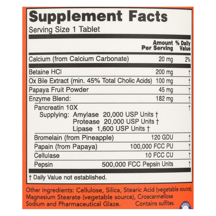 Now Foods Super Enzymes is a comprehensive digestive formula designed to support efficient and comfortable digestion. This carefully crafted blend combines potent enzymes to assist in breaking down fats, carbohydrates, and proteins, promoting nutrient absorption and overall digestive well-being. Each tablet contains a powerful combination of ingredients, including bromelain, ox bile, pancreatin, and papain, working synergistically to optimize digestive processes. With Now Foods Super Enzymes, individuals can experience enhanced digestive comfort and support their body's ability to process essential nutrients effectively. This product is made in the United States with high-quality ingredients to ensure purity and potency.