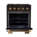 This premium gas range features powerful burners, each manually controlled by gold knobs, allowing you to cook with precision. The heavy-duty cast iron grates provide a sturdy and stable surface for all your pots and pans, while the spacious oven offers plenty of room for baking, and roasting your favorite dishes. The shorter kickplate design unveils a fancy set of squared gold legs, matching the knobs and the handle.