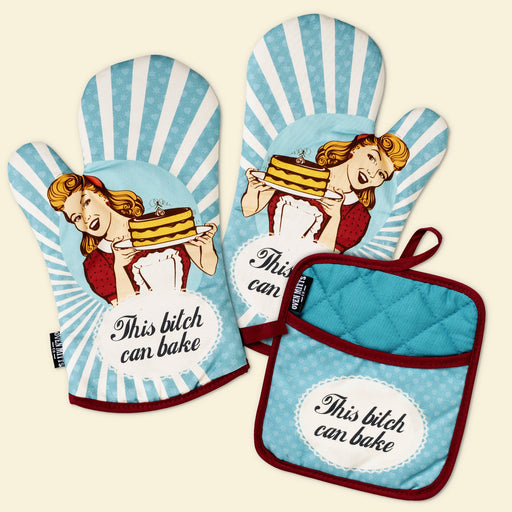 Boy, can she bake! Our retro-inspired oven mitts and potholder set features a fun 50’s vintage print in blue and white with cranberry accents. Brin...