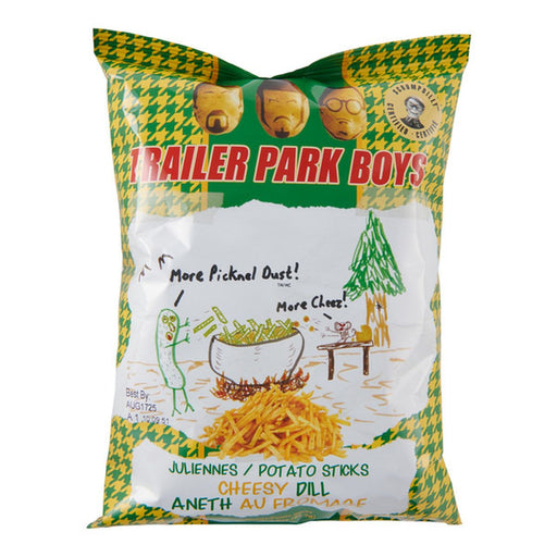 View full detailsA wild flavor combo that somehow works too well 🧀🥒🔥 Trailer Park Boys Cheesy Dill Juliennes (99.2g) (Canada) delivers crunchy, fry-cut style chips ...