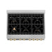 Combining the professional power and functionality of a ZLINE Range with stunning champagne bronze accents, this sophisticated line of professional ranges brings a new meaning of elegance. Create an unforgettable kitchen unique to your style with champagne bronze knobs, handles, legs, and brass burners.