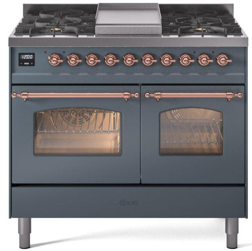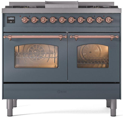 View full detailsILVE Nostalgie II 40 " Dual Fuel Natural Gas Range, Blue Grey, Copper Trim, UPD40FNMPBGP Please call (800)604-1380 Ext#2 before placing your order...