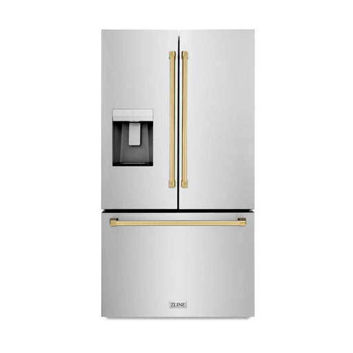 View full detailsZLINE Autograph Edition 36" 4-Door French Door Refrigerator, Water, Ice Dispenser, Black Stainless Steel, Polished Gold Square Handles RFMZ-W-36-...