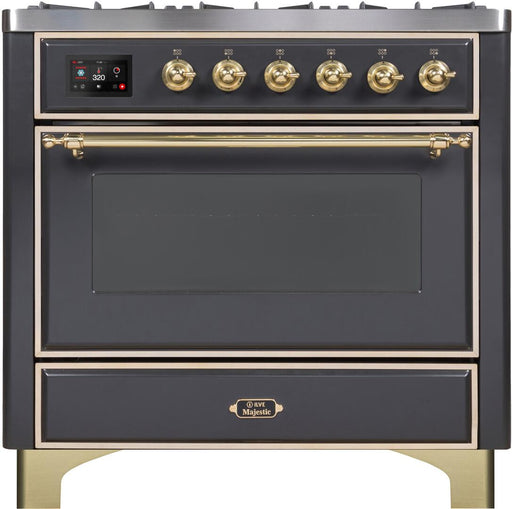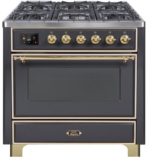 View full detailsILVE Majestic II 36 Inch Dual Fuel Natural Gas Freestanding Range in Matte Graphite with Brass Trim UM096DNS3MGG Please call (800)604-1380 Ext#2 b...