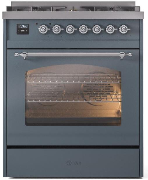 ILVE Nostalgie II 30 Inch Dual Fuel Natural Gas Freestanding Range in Blue Grey with Chrome Trim UP30NMPBGC Please call (800)604-1380 Ext#2 before...