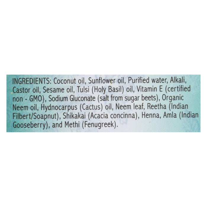 ingredients : coconut oil;sunflower oil;purified water;alkali;castor oil;sesame oil;tulsi (holy basil) oil;vitamin e (certified non-gmo);sodium gluconate (salt from sugar beets);organic neem oil;hydnocarpus (cactus) oil;neem leaf;reetha (indian filbert/soapnut);shikakai (acacia concinna);henna;amla (indian gooseberry);and methi (fenugreek)