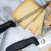 Formaticum professional cheese knives are the highest quality cheese tools. These knives are handmade in Italy and feature stainless steel blades and black polyethylene handles. The offset handle design makes them easy to use, resulting in clean, professional cuts every time. This is a general cheese knife with a tasting fork at the tip. Cut all types of cheese and then easily share tastes with friends. Formaticum professional cheese knives should always be hand-washed.