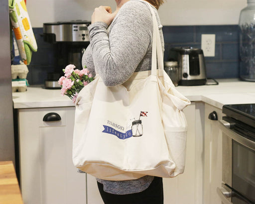 View full detailsMade Entirely of Organic Cotton Six Jar Compartments - Fits up to 64oz Half Gallon Mason Jars Bag Measures Approximately 15.5"x8.5"x14" Pockets Mea...