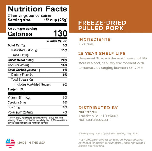 100% Premium-Quality, High-Protein, USDA-Inspected Freeze-Dried Pulled Pork | 25 Year Shelf-Life | Made in USA Prep Instructions: Add 1/2 cup of h...