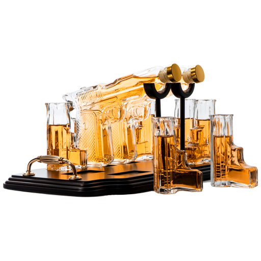 View full detailsShock your guests with this double Pistol Gun Decanter & 6 Shot Glasses Set paired with a wooden display stand. Can you imagine how classy thi...