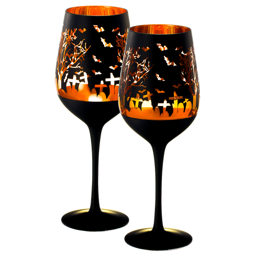 View full detailsThe Black & Gold Spooky Graveyard Patterned Stemmed Wine Glass showcases a distinctive design with its frosted black exterior and shiny gold...