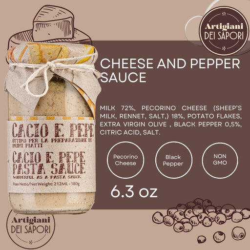 View full details[short_description]Artigiani dei Sapori, Cacio e Pepe Pasta Sauce, Creamy Cheese and Pepper Pasta Sauce Jar 6.3 oz (178gr), Italian Cheese Sauces w...