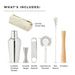- Includes: Cobbler cocktail shaker, Hawthorne strainer, bottle opener, jigger, bar spoon, muddler, and canvas storage bag