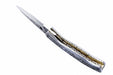 The Damascus steel blade shows natural layered patterns formed during forging, not surface etching. Engraved metal handle scales are paired with polished brass liners, adding warmth, contrast, and structural strength. The folding action is smooth and secure, making this knife suitable for careful everyday carry or display in a collection.