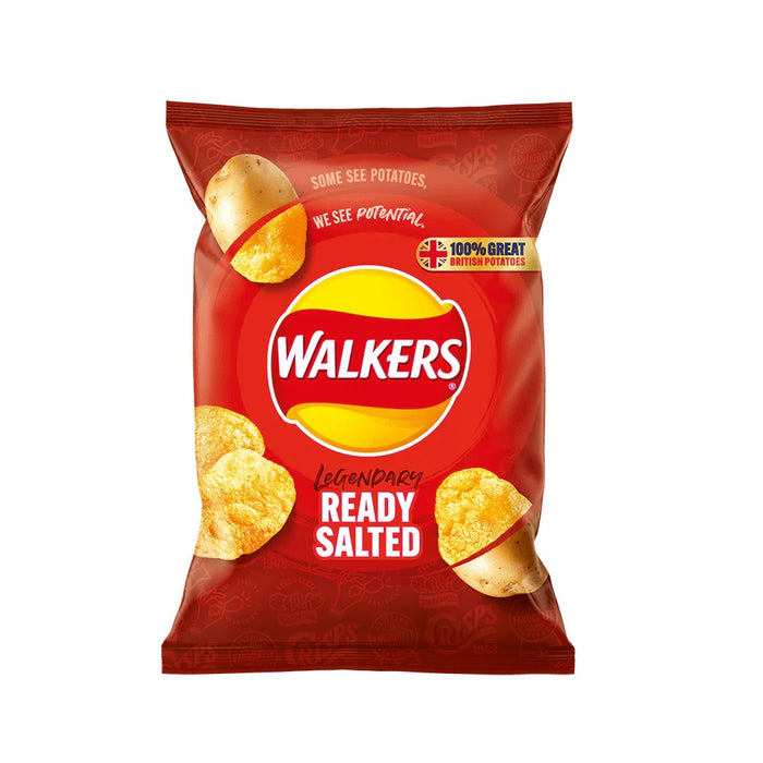 Experience the delicious, classic taste of Walkers Ready Salted Crisps. Each 32.5g bag is perfectly seasoned with just the right amount of salt for a satisfyingly savory snack.