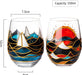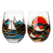 - BEAUTIFUL MASTERPIECE: These hand painted stemless wine glasses were individually made by artisan glassblowers and uniquely crafted. Each individual set comes with two hand-painted glasses designed for you and a loved one and features and incredible design of a sailboat on the ocean and a Sun rising over the water. Truly an eye-catching, beautiful image to admire as you enjoy your favorite wine.