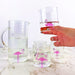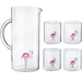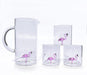 - Bring color and texture to your table with this Flamingo themed glassware set! Pour your favorite beverage into the tall rim glasses, and raise a toast to good friends. Superb quality with a heavy feel, crafted from borosilicate glass. Inspired by the amazing flamingo, this pitcher set will make an exquisite statement at your next gathering. The beautiful pink coloring is vivid against the glasses, making this pitcher and glass set both eye catching and functional!