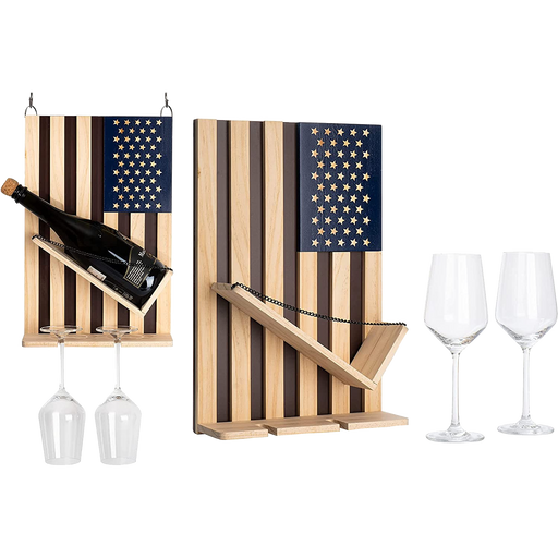 View full detailsThe Wine Savant American Flag Wooden Wine Bottle Holder Wall Rack Set with 2 Wine Glasses makes a perfect gift for your wine enthusiasts and loved...