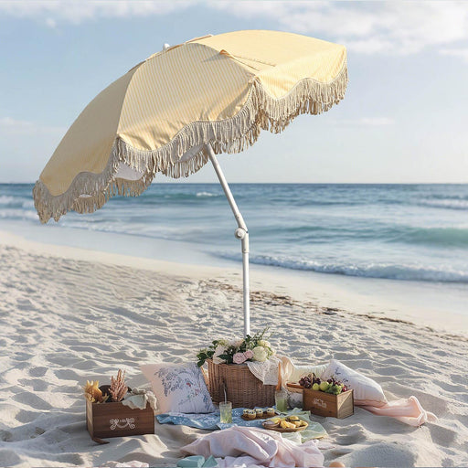 View full details6 ft Patio Umbrella boasts stripes on white canvas with cotton fringes, replicating the outdoor patio furniture design of the 50/60s. It brings an ...
