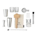 • Includes: Large Boston shaker tin, small shaker tin, double jigger measure, muddler, crystal mixing glass, Hawthorne strainer, twisted bar spoon, 2 crystal old fashioned glasses, Lewis ice bag and wooden mallet, 6 silver drink picks