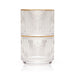 With stunning clarity and a rippled texture, this pair of stackable gold-rimmed tumblers are ideal for spirits on the rocks or lowball cocktails. The weighted base and rounded silhouette give each glass unique elegance that enhances your home bar or glassware collection.