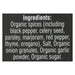 ingredients : organic spices;including black pepper;celery seed;parsley;marjoram;red pepper;thyme;oregano;salt;organic onion granules;organic garlic powder;organic sugar