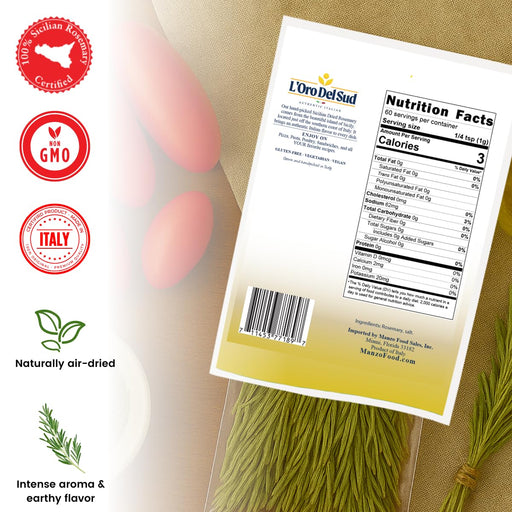 View full detailsL’Oro Del Sud – Sicilian Rosemary Leaves, 2.11 oz (60 g) Bring the fragrant, earthy aroma of Sicily to your kitchen with L’Oro Del Sud Sicilian Ros...