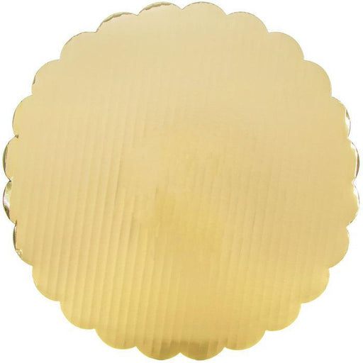 Cake Board - 10" Gold Scallop Cake Circle is a single wall cardboard covered with a non-grease absorbing gold foil with a pattern.