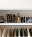 Nip it in the bag. Clutches, handbags, pocketbooks—they come in every shape and color! There’s no one-size-fits-all solution with purse storage, but this customizable organizer takes away all the frustration. Product comes with two square bases that can be snapped together or used independently. Eight vertical dividers that can slide into the grooves found in the base are also provided. Lifestyle images largely show the set of two snapped together. Lock the organizer into position according to the size of your bags to keep them all upright, perky, and pristine. Finally, a way to prevent your precious handbags from crushing one another in a giant heap.
