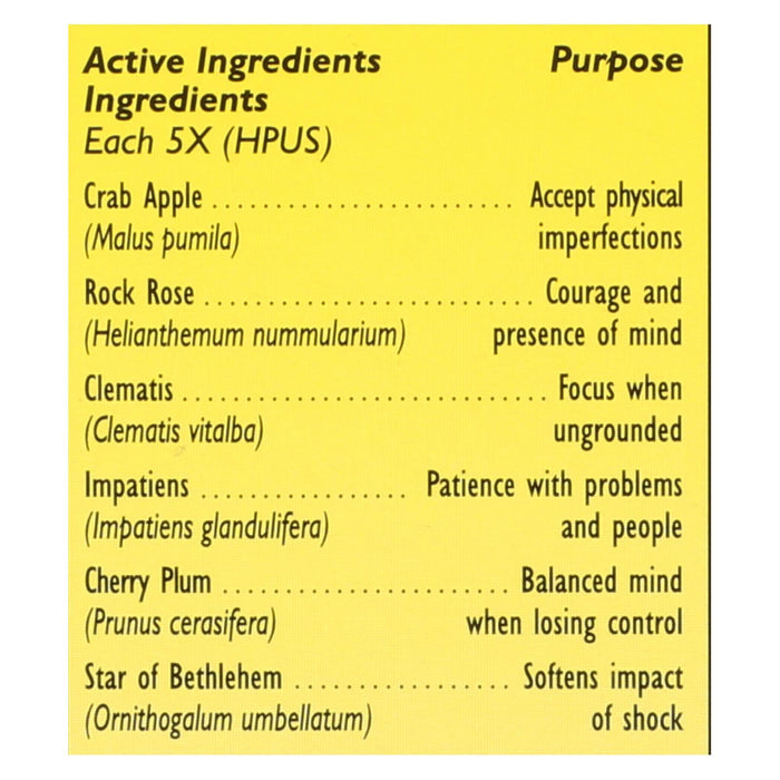- Contains calming properties of chamomile, crab apple, heather, impatiens, and star of Bethlehem