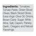 Tomatoes, Tomato Paste, Green Sliced Olives, Black Sliced Olives, Extra Virgin Olive Oil, Onions, Brown Cane Sugar, White Wine, Salt, Capers, Parsley, Garlic, Oregano and Natural Flavorings.