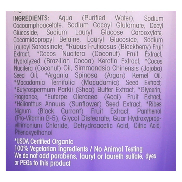 ingredients : aqua (purified water);sodium cocoamphoacetate;sodium cocoyl glutamate;decyl glucoside;sodium lauryl glucose carboxylate;cocoamidopropyl betaine;lauryl glucoside;sodium lauryl sarcosinate;rubus fruticosus (blackberry) fruit extract;cocos nucifera (coconut) fruit extract;hydrolyzed (brazilian cocoa) keratin extract;cocos nucifera (coconut) oil;simmondsia chinensis (jojoba) seed oil;argania spinose (argan) kernel oil;macadamia ternifolia (macadamia) seed extract;butyrospermum parkii (shea) butter e