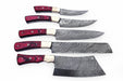 JW SteelCrafts Handmade Damascus Kitchen Knife Set – 5 Piece Chef, Santoku, Bread, Utility and Cleaver Knives with Red Pakka Wood Handles