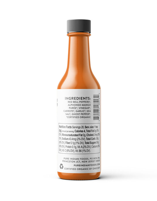 Introducing a new, wildly appetizing mango ghost pepper hot sauce. Deeply sweet Alphonso Mangoes lend this sauce a luscious, velvety-smooth texture and multi-layered sweetness to balance the heat of Organic Smoked Ghost Pepper. This hot sauce is more than just spicy, it's supremely decadent. This killer combo highlights each ingredient for sweet and tangy flavor that leaves you wanting more without being intensely hot.
