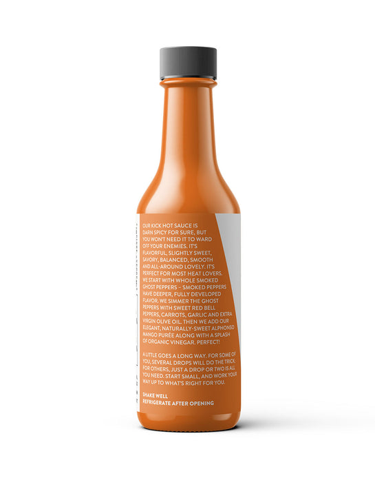 Our KICK Hot Sauce is darn spicy for sure, but you won’t need it to ward off your enemies. It’s flavorful, slightly sweet, savory, balanced, smooth and all-around lovely. It’s perfect for medium to extreme heat lovers. We start with whole smoked ghost peppers – smoked peppers have deeper, fully developed flavor. We simmer the peppers with sweet red bell peppers, carrots, garlic and extra virgin olive oil. Then we add our elegant, naturally sweet Alphonso Mango Purée along with a splash of organic vinegar to create a decadent mango hot sauce. Perfect!