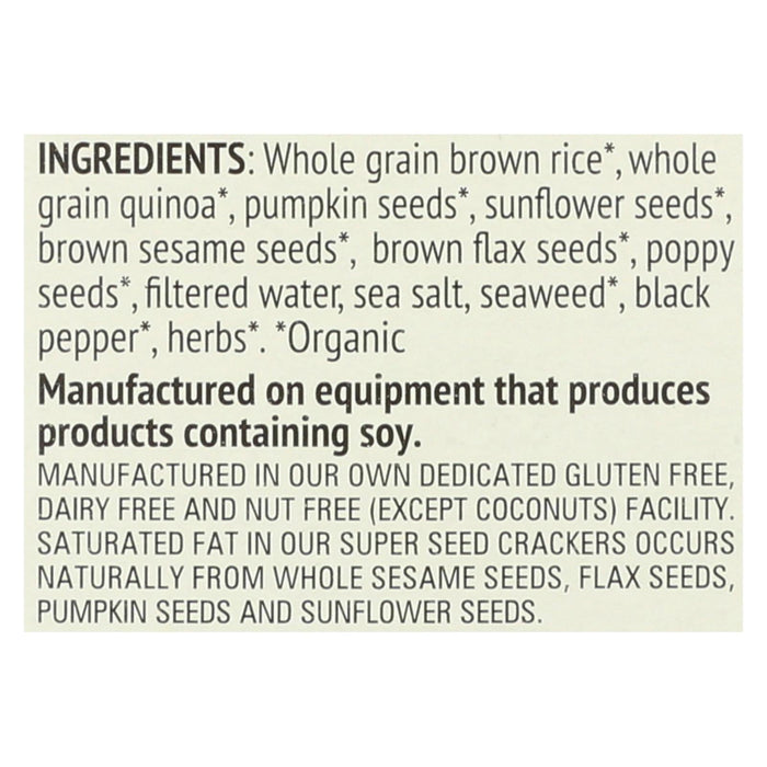 Enjoy simple organic seed-based snacks without the seedy aftertaste. Super Seed crackers are made with 5 superseeds (chia, sesame, sunflower, pumpkin and flax) and simple wholesome ingredients. They are a good source of fiber (more than oats) and a good source of plant-based Omega-3 fatty acids. No compromise on taste, no refined ingredients, no additives or preservatives and non-GMO project verified.