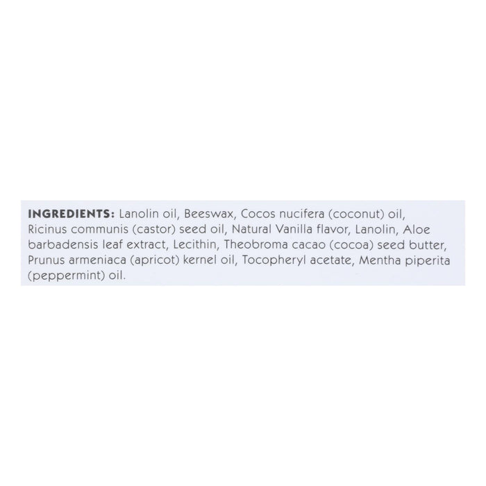 ingredients : lanolin oil;beeswax;cocos nucifera (coconut) oil;ricinus communis (castor) seed oil;natural vanilla flavor;lanolin;aloe barbadensis leaf extract;lecithin;theobroma cacao (cocoa) seed butter;prunus armeniaca (apricot) kernel oil;tocopheryl acetate;mentha piperita (peppermint) oil