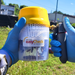 A small sample of young honey bees are removed from the hive and combined with rubbing alcohol or windshield washer fluid in the Varroa Check and shaken to wash adult varroa mites off the bees; dislodged mites fall through the small holes in the strainer basket and are easily counted.