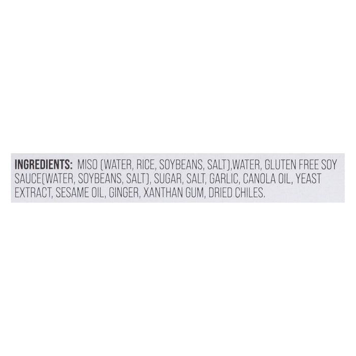 ingredients : miso (water, rice, soybeans, salt);water;gluten free soy sauce (water, soybeans, salt);sugar;salt;garlic;canola oil;yeast extract;sesame oil;ginger;xanthan gum;dried chiles