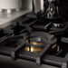 ZLINE’s professional black stainless steel is truly unique in the industry. Each piece is hand-cut and crafted utilizing premium grade stainless steel which accomplishes its sophisticated “piano black” finish through a technique called PVD (Physical Vapor Deposition) Coating. Also known as sputtering, this technique utilizes a vaporization process to create an atom-bonded, strong ceramic layer in order to achieve its stunning black stainless shine and built-to-last quality. The PVD ceramic layer is composed of abrasion-resistant material, ensuring that its pristine finish will be enjoyed for years to come. The industrial design of the (RAB) is executed through precise lines and detailing done with a precision laser. Each model includes Italian burners delivering over 44,000 BTU’s and also includes durable, solid-piece Cast Iron Grates finalizing its industrial look.